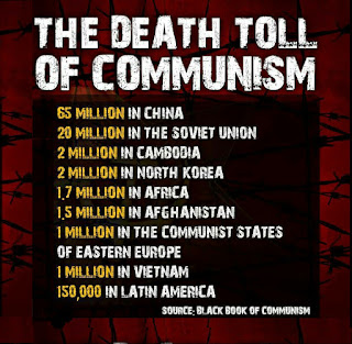 Look at the death toll results for Left wing dictatorships vs. Right wing dictatorships in the Western hemisphere the Left has a much lower body count. (Paraphrased)